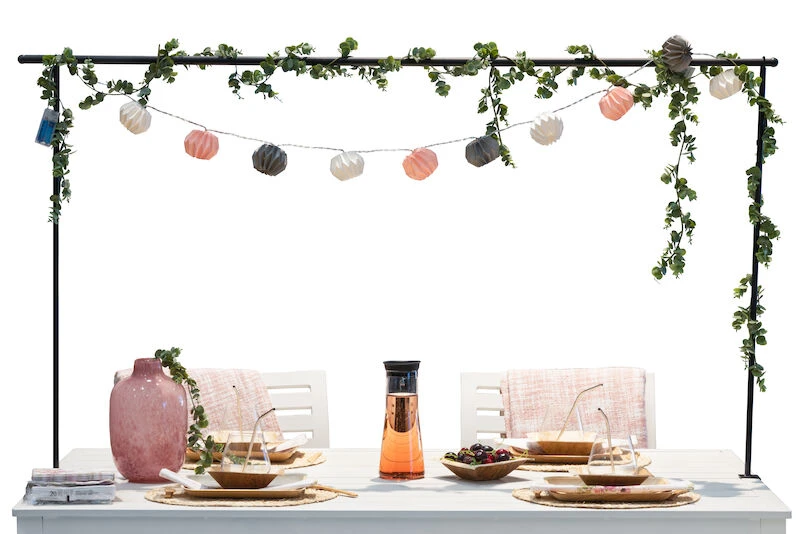 Mustalla 4Living pöydän koristetelineellä loihtii upeita ja näyttäviä pöydän kattauksia. Ripusta koristetelineeseen lempikoristeesi, lyhtyjä, valoja tai kasveja aina juhlasta ja vuodenajasta riippuen. Telineen leveys on säädettävissä 140-250 cm välille, joten se sopii erikokoisiin pöytiin. Tuotteen korkeus kasattuna on n. 100cm. Helppo ja nopea kiinnittää pöytään.