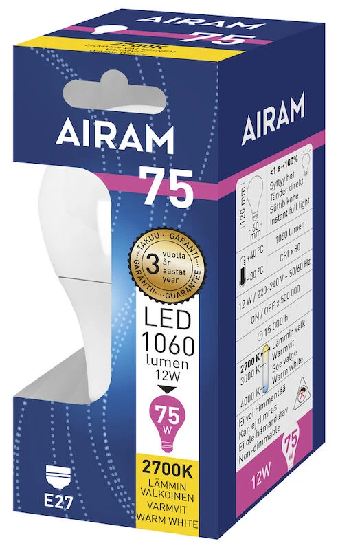 Lamppuvalinnan helpottamiseksi Airam led 2700K -lamput on pakattu informatiivisiin pahvipakkauksiin, joista olennaiset asiat, kuten lampun tekniset tiedot, on helppo erottaa ja lukea. Pakkauksen värikoodi kertoo lampun hehkulamppuvastaavuuden. Kattava mallisto täyttää kodin eri lampputarpeet. Lamppujen koot ja valotehot vastaavat täysin hehku- ja halogeenilamppuja. Airamin led-lampuilla on kolmen vuoden takuu. Ekologinen pakkaus, ei muovia.