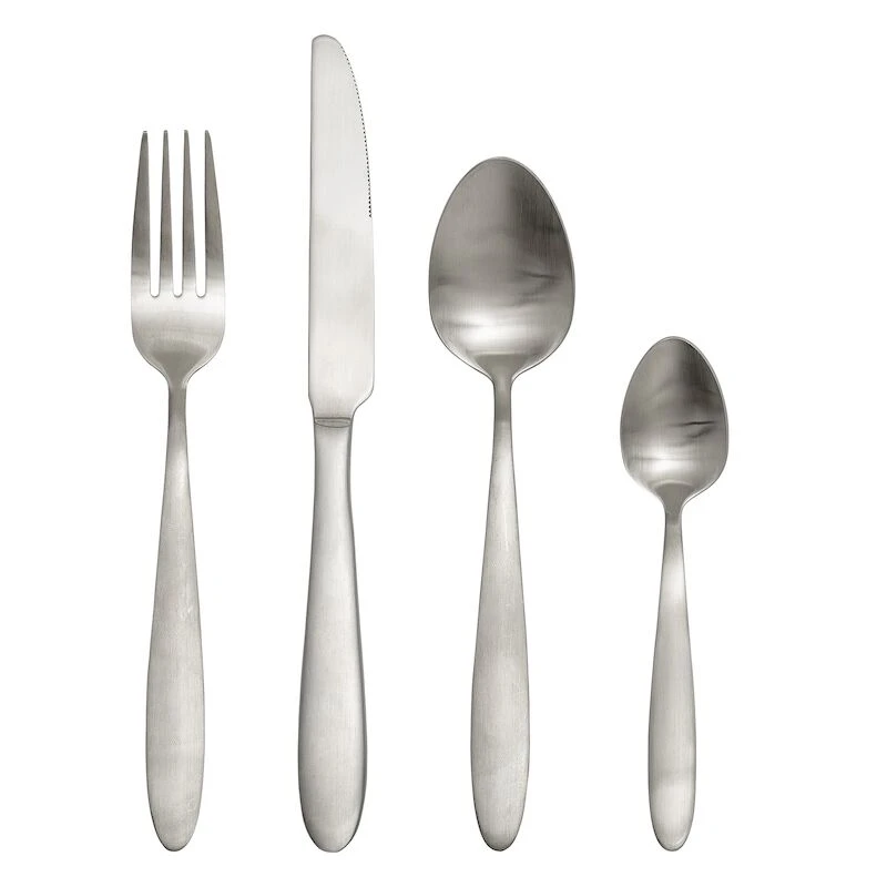 Upea ja tyylikäs hopean sävyinen ruokailuvälinesetti jokapäiväiseen kattaukseen. Aterinsetti sisältää kuvan mukaiset ruokailuvälineet (4 kpl) Ruostumatonta terästä, konepestävät.