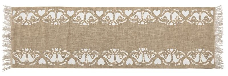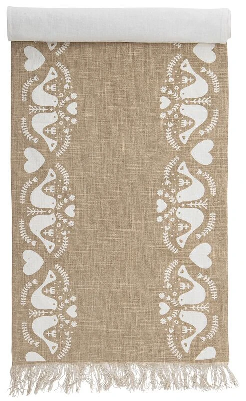 Bloomingvillen Paule kaitaliina on klassinen ja perinteinen jouluinen kaitaliina. Luonnonvärisessä liinassa on koristeina rauhankyyhkyt ja sydämet, jolla saat kodikasta tunnelmaa sisustukseen. Liina on 100% puuvillaa.