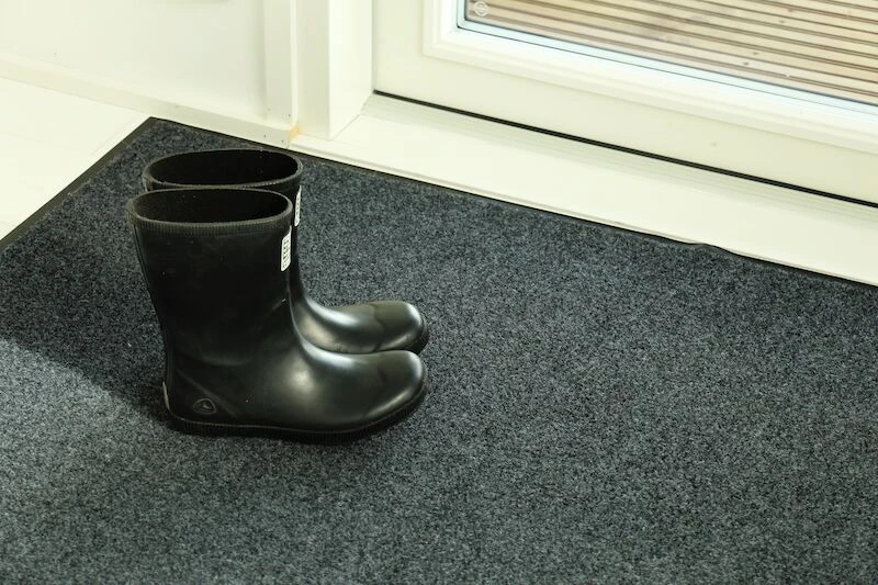Tummanharmaa Day kuramatto on kätevä kodin eteistiloihin. Maton pinta on polyesteriä ja pohja pcv:tä.