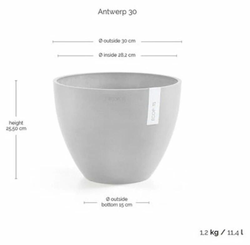 Antwerpen on kaunis kaupunki Shcelde joen varrella. Kaupungissa teollisuus ja elämästä nauttiminen kulkevat käsi kädessä. Ruukku on saanut inspiraation Bolleke lasista (lasia käytetään Belgialaiseen olueen). Ruukku ei ole pelkästään elegantti, se sopii designiltaan puutarhaan ja sisätiloihin. Ruukun tehtävä on symboloida myös hyvinvointia, joka ajaa kaupunkia eteenpäin. Antwerpen, kuten kaikki Ecopotsin ruukut on valmistettu ympäristöystävällisestä materiaalista eli ruukku on ekologinen valinta, sillä se on myös täysin kierrätettävä. Ruukku on valmistettu 80% kierrätetystä muovista ja 20% kierrätetystä luonnollisesta kivijauheesta. Ecopotseilla on CO² neutraali -sertifikaatti, eli niiden hiilijalanjälki on kompensoitu. Ruukku on viimeistelty käsityönä, se on UV-suojattu, kevyt, sopii sisä-ja ulkokäyttöön, kestävä ja kaiken lisäksi kestää pakkasta! Ruukkujen käyttöikä on jopa 10 vuotta. Ruukun pohjassa on tulppa, joka helpottaa ylimääräisen veden pois pääsyä. Ruukku soveltuu ympärivuotiseen käyttöön, kunhan pohjatulpan muistaa ottaa pois, jotta ylimääräinen vesi pääsee poistumaan ruukusta. Jos pohjatulppaa ei ota talveksi pois, voi ruukku haljeta. Sisätiloissa kannattaa harkita lautasen käyttöä ruukun alla, vaikka tulppa onkin lähes 100% tiivis.