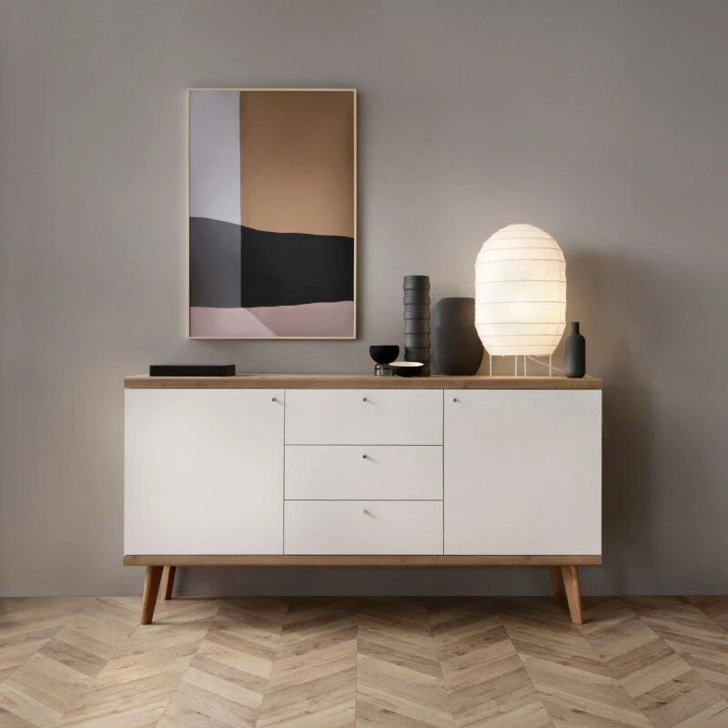 Senkissä on tammen värinen 16 mm laminoitu kalustelevyrunko ja valkoiset etusarjat ABS-reunanauhalla. Kauniit 20 cm korkeat tammijalat helpottavat siivousta sekä antavat kauniin ja kepeän ilmeen senkille. Senkki sisältää kolme vetolaatikkoa ja kaksi kaappia yhdellä välihyllyllä ja alumiinivetimillä.
