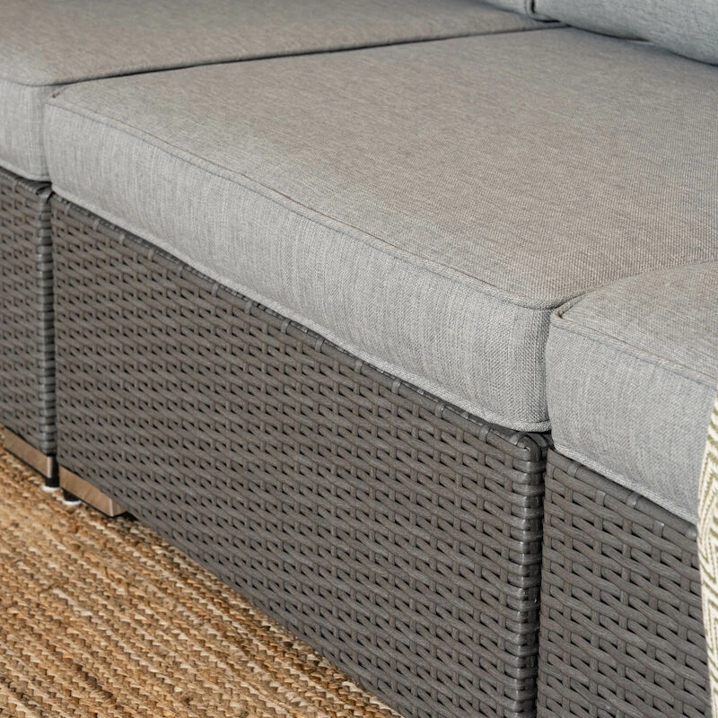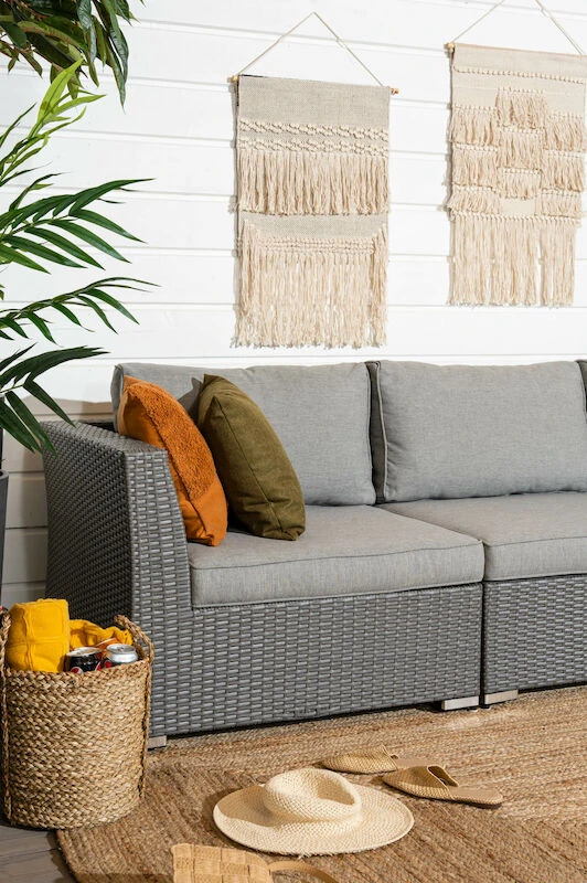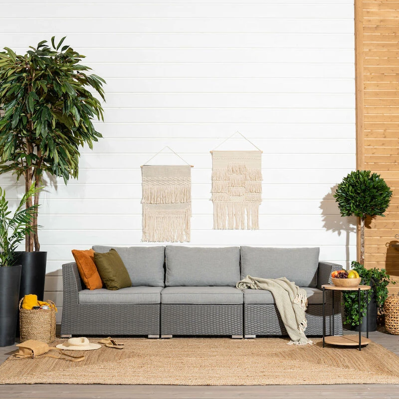 Kevyt, kestävä ja tyylikäs 3-istuttava ulkosohva koostuu kahdesta kulmamoduulista ja yhdestä keskimoduulista, jotka on kiinnitettynä toisiinsa kätevillä kiinnikkeillä. Sohvassa on muhkeat pehmusteet, joiden päälliset on irroitettavissa ja pestävissä. Kangas on laadukas ja vettä hylkivä. Sohva tuo istumatilaa ja siinä on mukava viettää kesäpäiviä. Ostamalla lisää moduuleja Hede sarjasta, saat laajennettua tuotetta helposti.