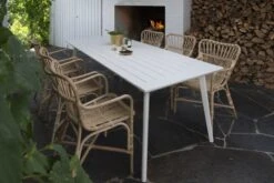 6-hengen laadukas ja helppohoitoinen Hillerstorp Hånger ruokapöytä. Runko on valkoiseksi maalattua alumiinia. Pöydän kansi on aintwoodia, joka on puristettua muovia, mutta näyttää aidolta puulta. Ajattomaan pöytään on helppo yhdistää minkälaiset tuolit tahansa.