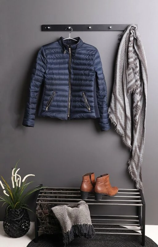 Tyylikäs musta poppelipuusta valmistettu vaatenaulakko viidellä metallisella nupilla.