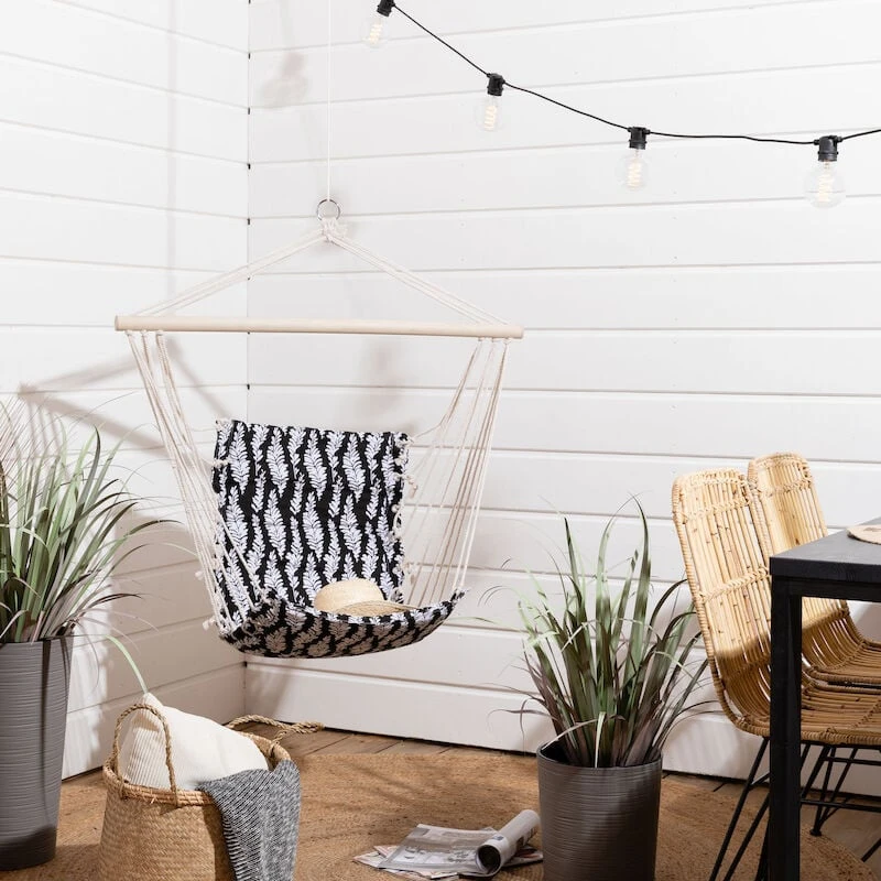 Ihastuttava Lehti-riippuistuin sopii esimerkiksi ulos parvekkeelle tai sisälle lukunurkkaukseen. Riippuistuimessa on rento istuskella illan hämärässä tai kotona kynttilän valossa tunnelmoidessa. Tyylikäs, kuvioitu riippuistuin houkuttelee hetkeksi rentoutumaan. Ei sisällä ripustusköyttä.