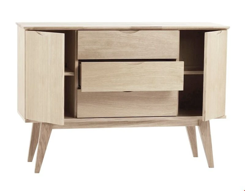 Laadukas ja tyylikkäästi muotoiltu Filippa senkki. Materiaali viilutettua kalustelevyä ja tammea. Senkin leveys on 122 cm, siinä on kaksi ovellista kaappia ja keskellä kolme laatikkoa, senkki sisältää siis hyvin säilytystilaa. Korkeat, viistomaiset jalat keventävät ilmettä ja helpottavat siivousta.