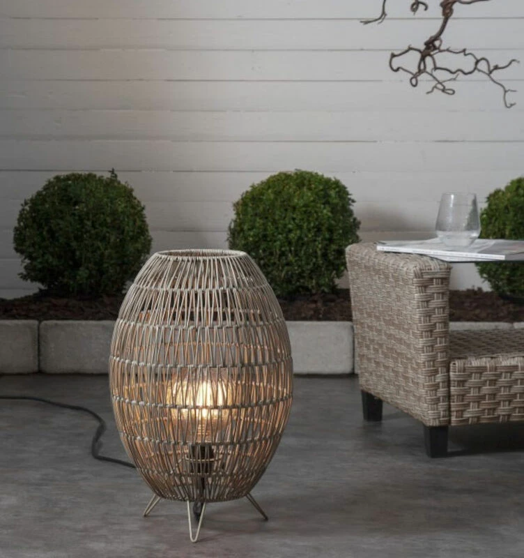 Tyylikäs polyrottingista valmistettu Linde lattiavarjostin. Voidaan käyttää sekä sisällä että ulkona. Lattiavarjostinta voidaan käyttää myös lyhtynä. Käytä silloin ainoastaan LED-kynttilöitä. Lattiavarjostin ei sisällä tarvittavaa johtosarjaa eikä valon lähdettä. Ulkokäytössä yhdistä varjostimeen E27-kantainen