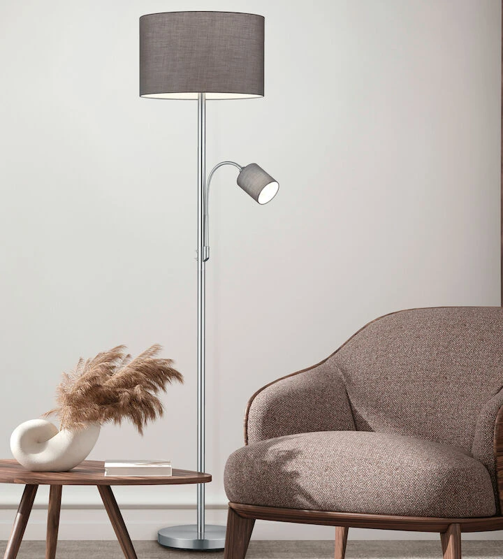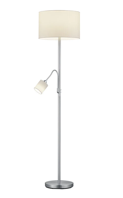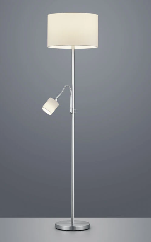 Hotellimaista tunnelmaa kotiisi Trion Hotel lattiavalaisimella. Runko on harjattua terästä, kankainen varjostin. Varjostin antaa valoa sekä ylä- että alakautta. Lukuvaloa voi säätää spivaan asentooni joustavan varren ansiosta. Valot on kykettävissä päälle erikseen on/off-katkaisijalla. Jalkaosan halkaisija 28 cm. Kuvun halkaisija 40 cm ja korkeus 25 cm. Lukuvalossa korkus on noin 100cm, kuvun halkaisija on 9 cm ja korkeus 10 cm. Johdon väri on musta. Valonlähteet: 1xE27 max. 60W ja 1XE14 max 18W.