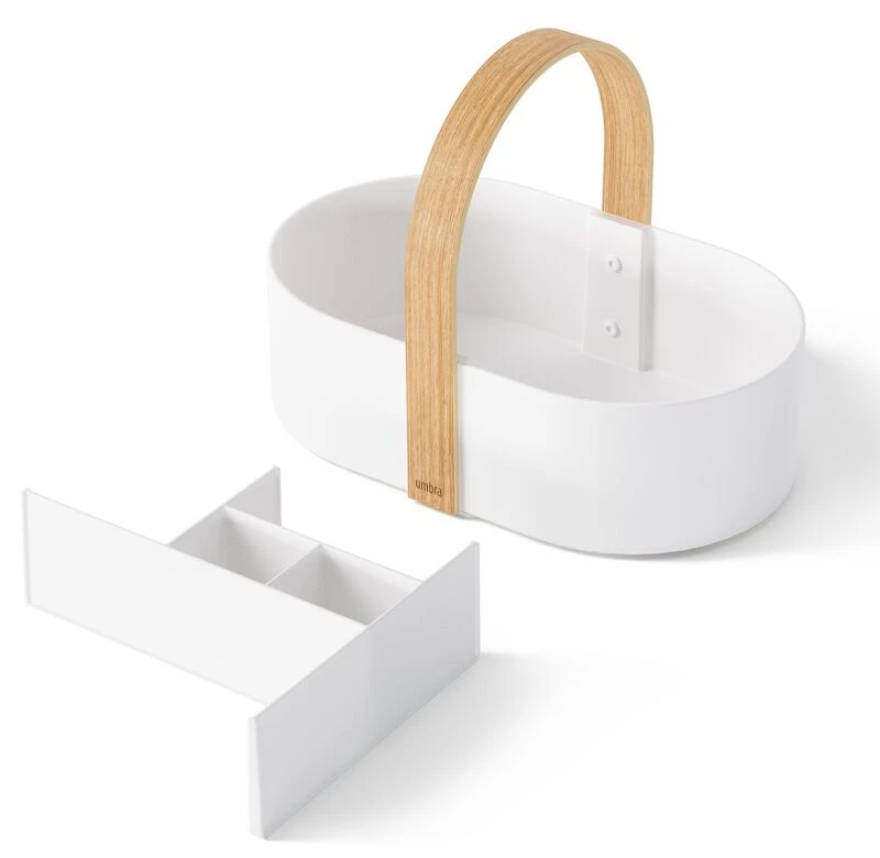 Umbra Bellwood säilytyskorin avulla pidät järjestyksessä päivittäin käytössä olevat tavarat siististi ja tyylikkäästi. Monipuolinen säilytysrasia niin meikeille ja ihonhoitotuotteille kuin askartelu- ja toimistotarvikkeille. Säilytyskorin sisällä on irrotettava tilanjakaja, joka erottelee tavarat ja tukee niitä tarvittaessa. Pohjassa olevat kumitallat puolestaan suojaavat pöydän pintaa.
