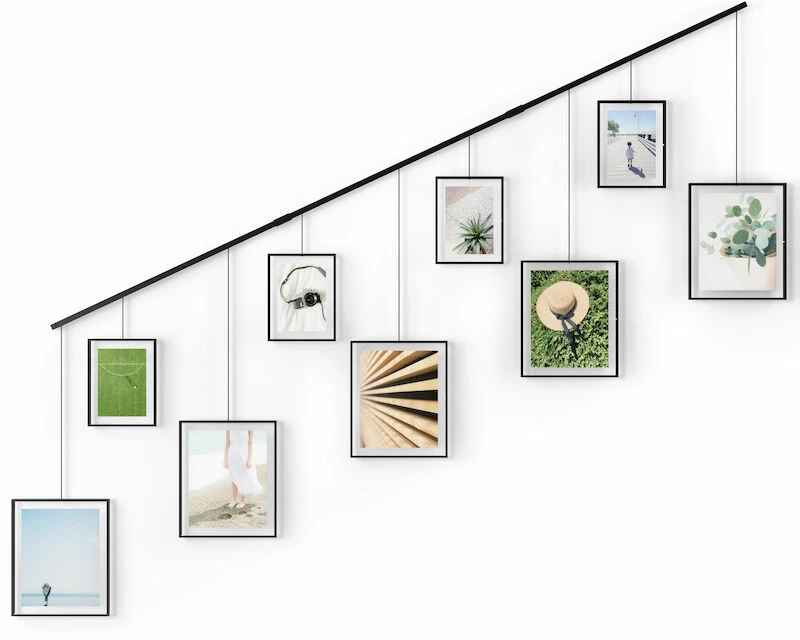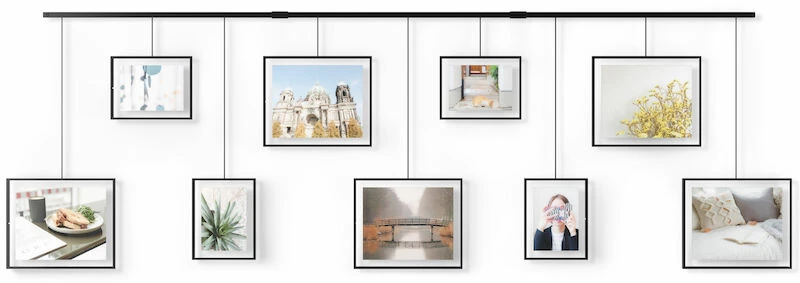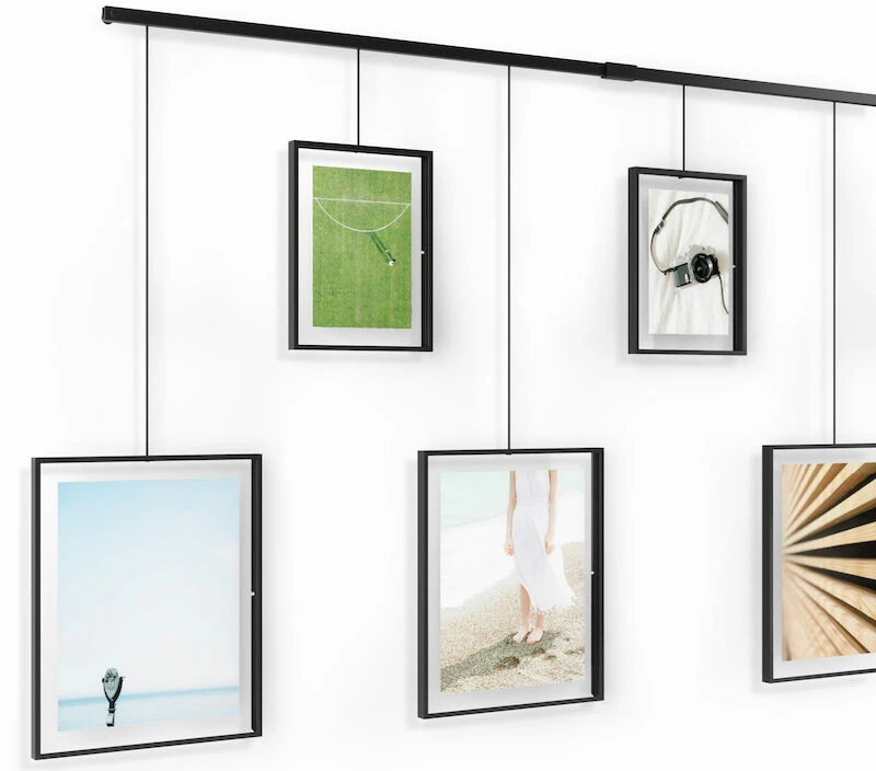 Umbra Exhibit 9-osainen kehyssetti on seinään kiinnitettävä kehys. Kehyksessä on pidikkeet ja kiinnikkeet, siihen mahtuu yhteensä 9 eri kokoista kuvaa. Kuvien kannakkeet ovat kiinni kiskossa ja niitä voi liikutella vapaasti. Joustava vaakasuuntainen ripustusominaisuus mahdollistaa Exhibitin käytön myös portaikossa. Kuvakehyksiä voi kääntää myös pysty- tai vaakasuuntaan. Kehyksessä on viisi 20×25 cm kokoista ja neljä 12,7×17,7 cm kokoista kehystä.