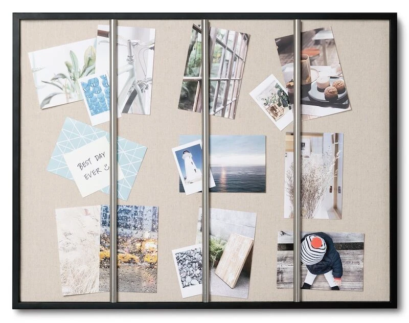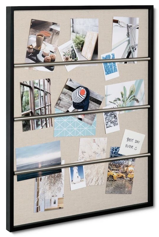 Asettele haluamasi valokuvat, kortit ja muistilaput helppokäyttöiselle valokuvatelineelle. Kuvat pysyvät kiinni metallisten tankojen avulla, joten nastoja ei tarvita kiinnittämiseen. Telineen voi ripustuu pystysuoraan tai vaakatasoon. Pellavakankaalla päällystetyt taustat ja modernit mustat kehykset antavat tyylikkään ja ryhdikkään ilmeen. Tämä ihastuttava valokuvateline sopii niin olohuoneeseen, makuuhuoneeseen, eteiseen kuin toimistoonkin.