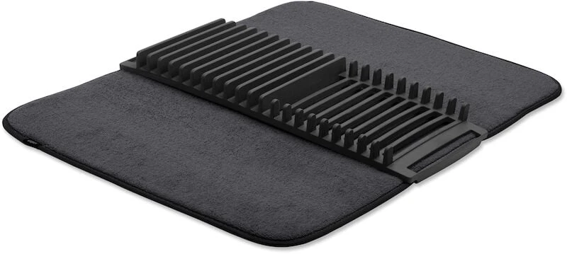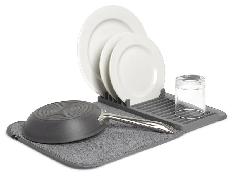 Kevyt, taitettava ja helposti säilytettävä Umbra Udry astiankuivausmatto. Muovista valmistettu lautasteline ja mikrokuituinen kuivausmatto. Takuu viisi vuotta.