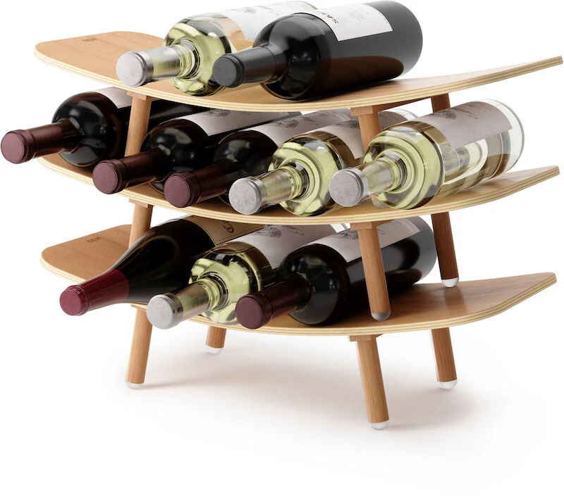 Umbra Vinola viinipulloteline on kurvikas vanerista valmistettu teline, jota voi käyttää myös pyyhkeiden esillepanoon. Osta useampi ja pinoa, niin saat tuplattua tai jopa triplattua säilytystilan. Telineeseen mahtuu 5 viinipulloa ja telineitä voi pinota maksimissaan kolme päällekkäin.